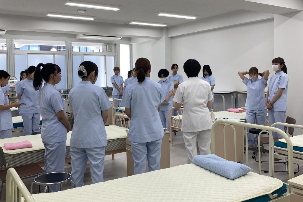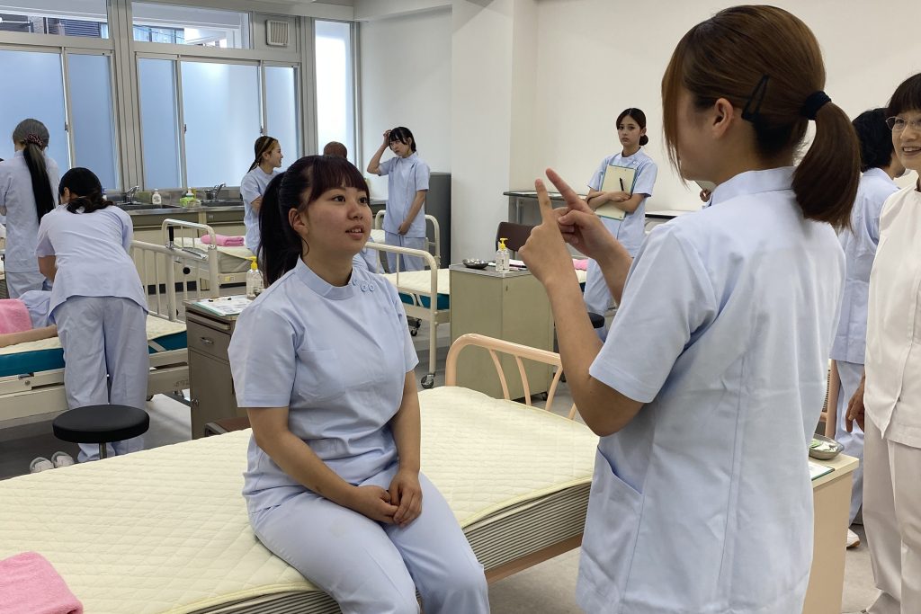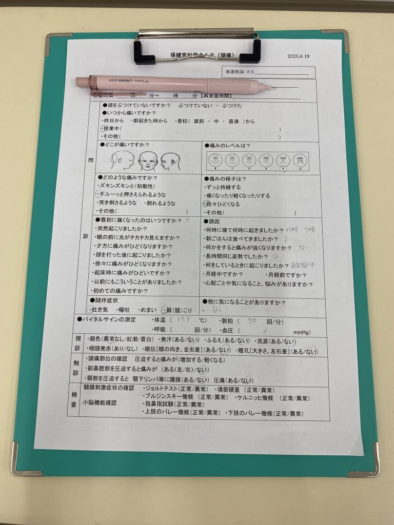 この日の実技演習では、学生が養護教諭役と子ども役を交代で演じながら、頭痛を訴える子どもへの対応を実践✨問診、バイタルサインの測定、視診、触診などをしながら緊急性の有無を確認します。子どもの気持ちをしっかり受け止め、不安を取り除く声かけやプライバシーの保護など、実際の場面をイメージしながら丁寧に取り組みました。