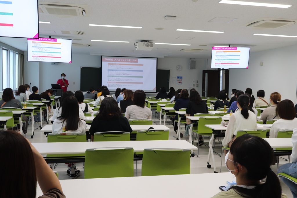 大講義室で全体説明を行います。本学の概要や特徴などについてにお話しいたします。