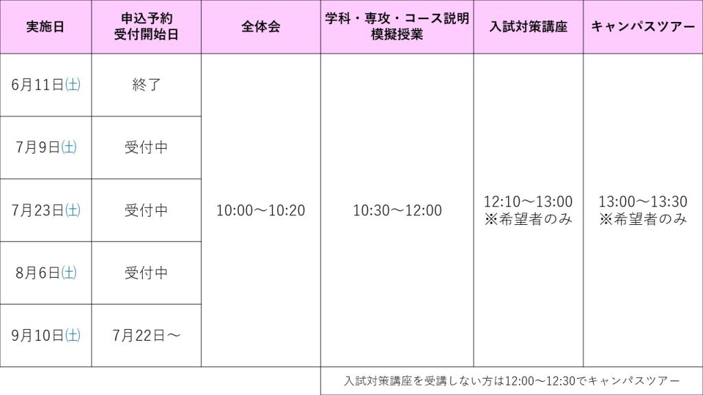 ※午前中のオープンキャンパスからご参加される方と付き添いの方1名に軽食をご用意いたします。